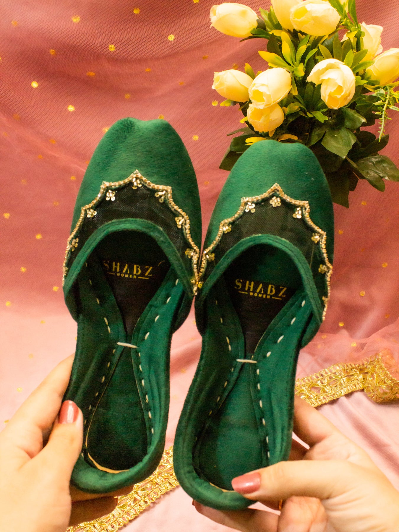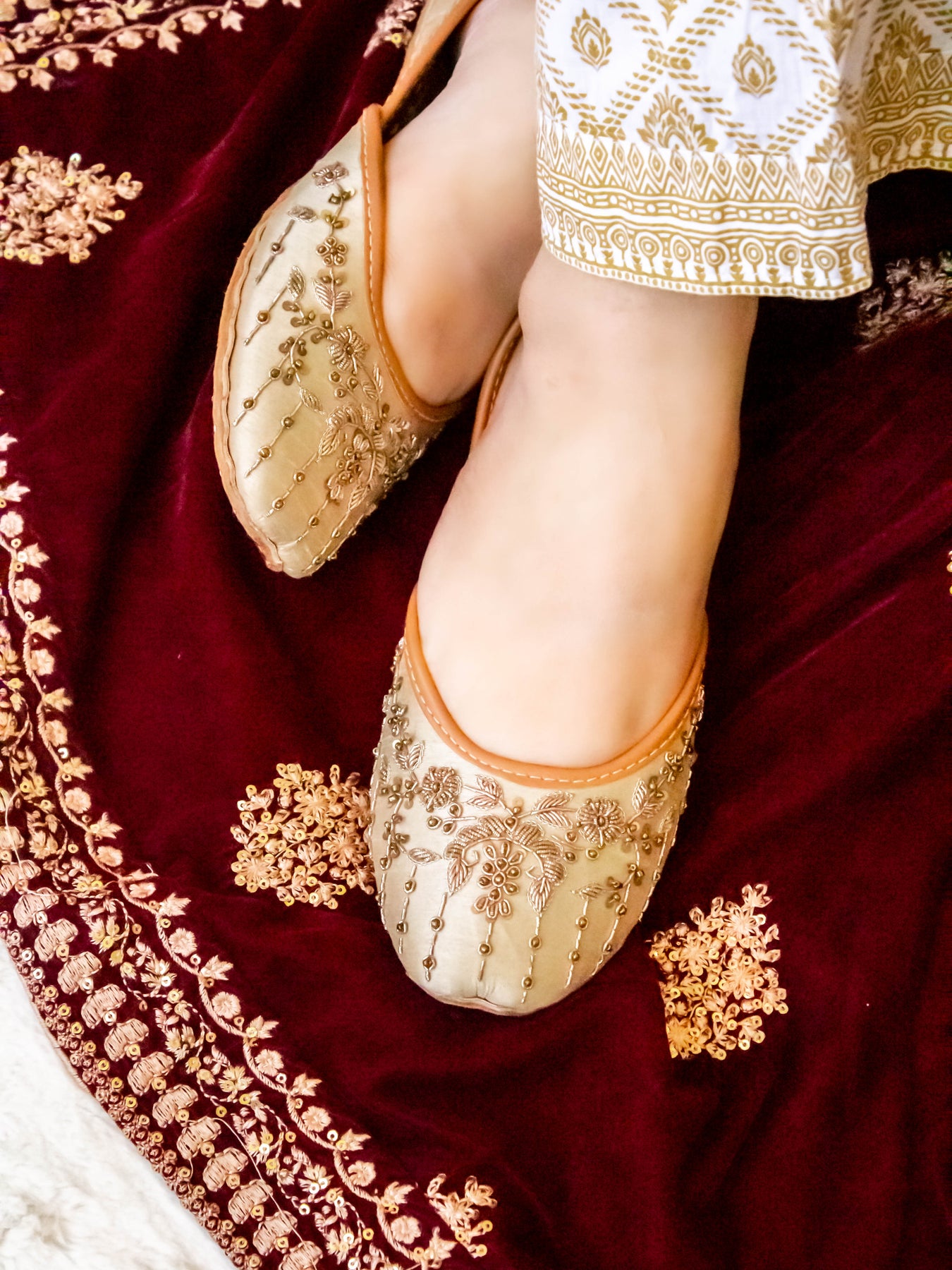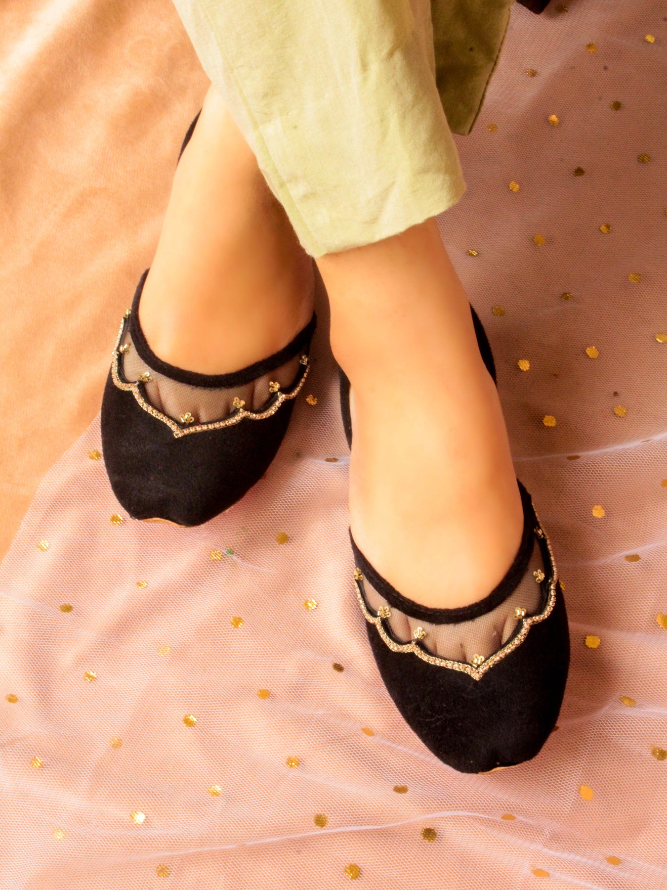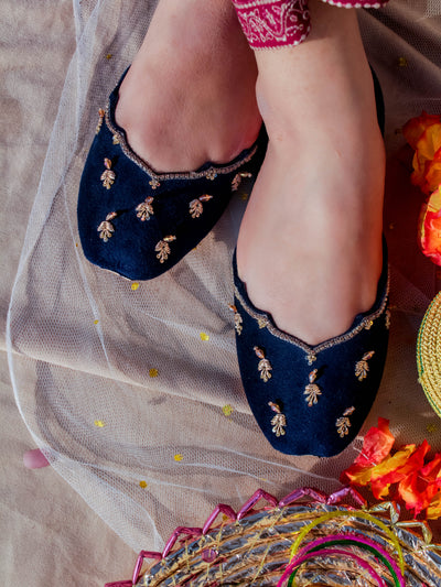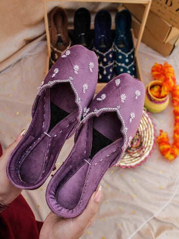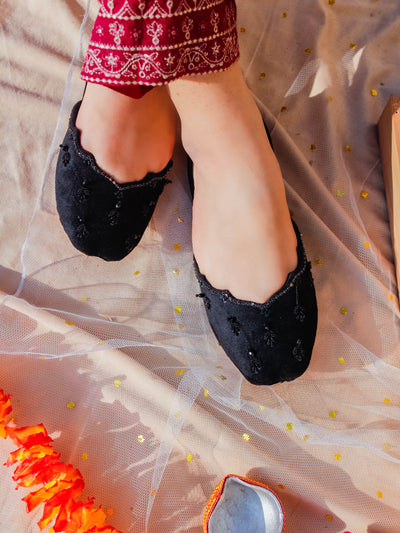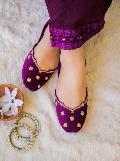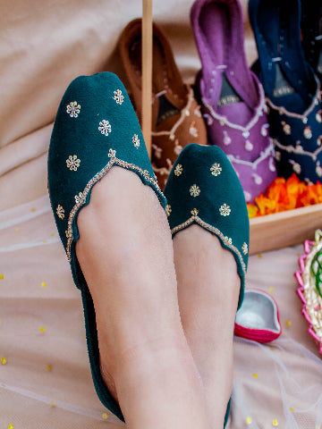 Fresh, feminine, and full of sparkle — our Sun Beam Khussa is made to brighten up every step. Crafted in a beautiful light lemon yellow velvet, this pair features cheerful daisy flower prints paired with intricate dabka and sequin handwork that glimmers in the light.