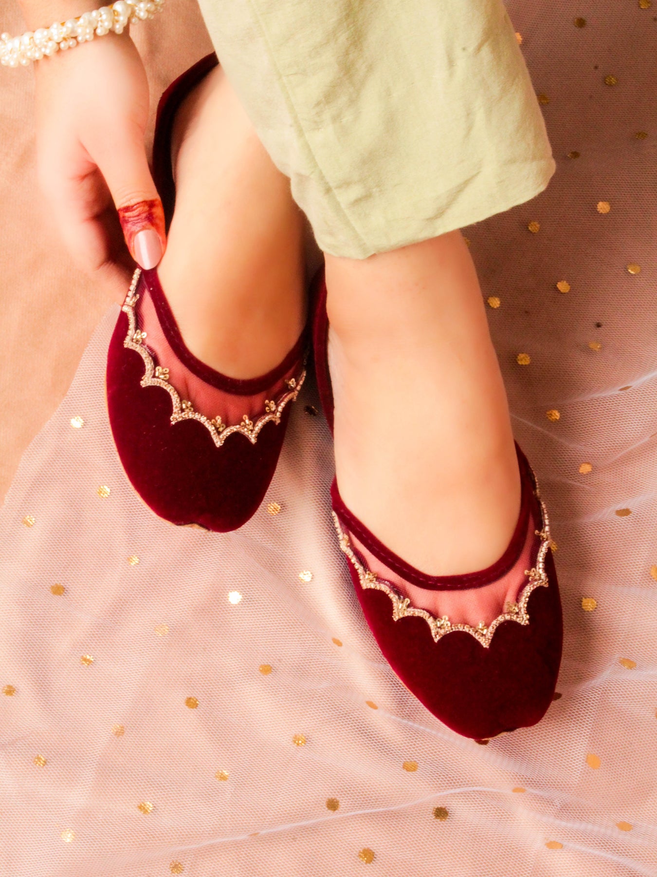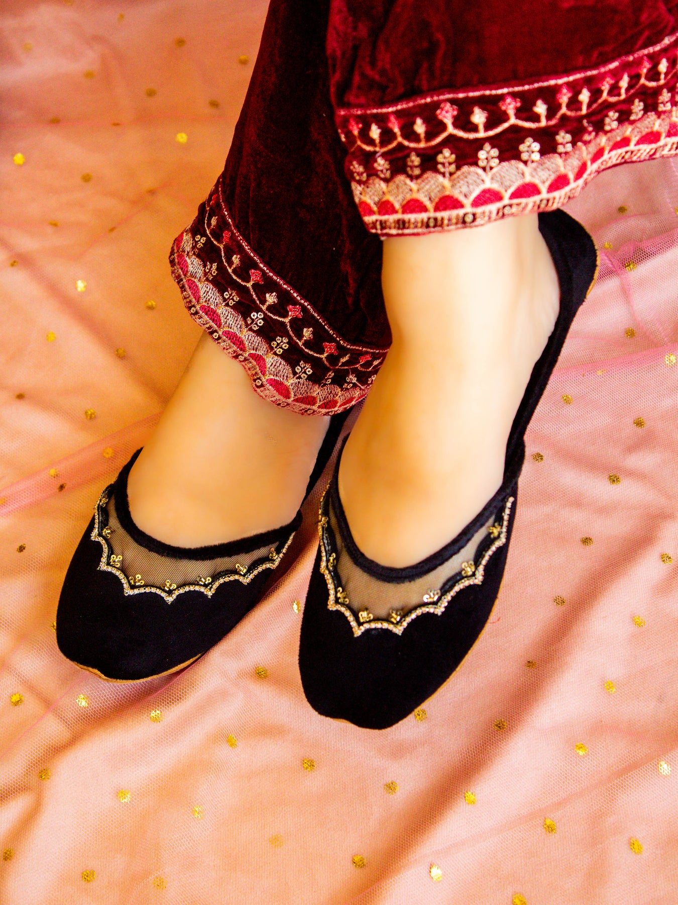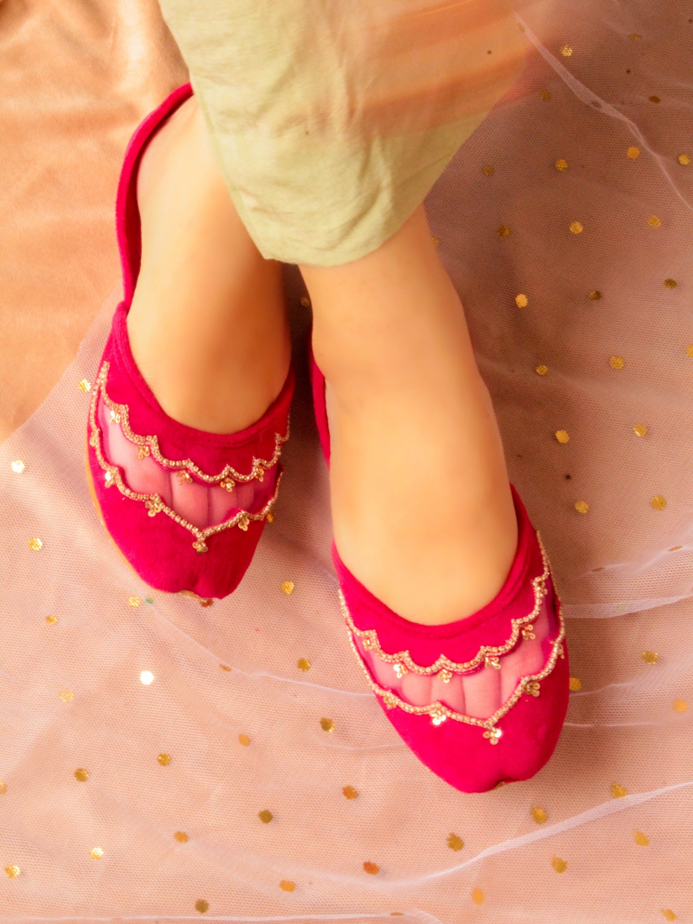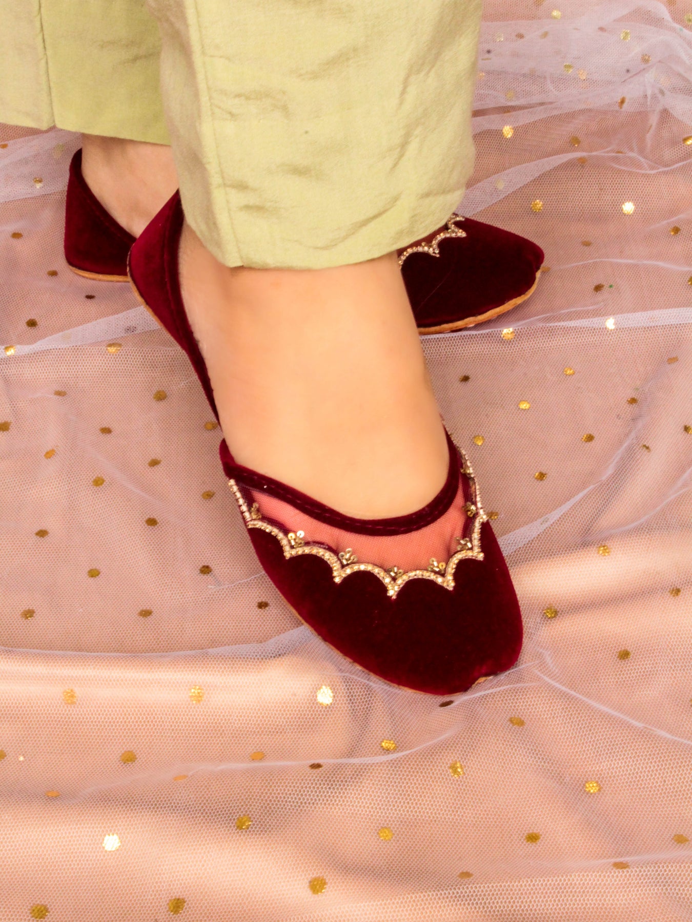 Fresh, feminine, and full of sparkle — our Sun Beam Khussa is made to brighten up every step. Crafted in a beautiful light lemon yellow velvet, this pair features cheerful daisy flower prints paired with intricate dabka and sequin handwork that glimmers in the light.