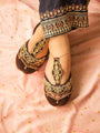 This signature toned hand embroidered with scalloped details jutti is topped with a delicate motif joined with a chain giving it a distinctive effect of bejewelled anklets