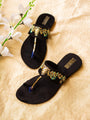 When tradition meets modern artistry, you get Gulposh – a black velvet kolhapuri that speaks of elegance with every step. Its intricate gold handwork is delicately laced with hints of firuzi threadwork, adding a pop of regal blue, while crystals shimmer with every movement.