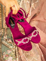 Senorita - The impeccably hand crafted suede Magenta heel is a Piece of art. This is entirely hand embroidered velvet heel incorporating both silver and ivory embellishments into a geometric cross check and Floral motifs. A perfect fit for your festive heel needs.🖤✨