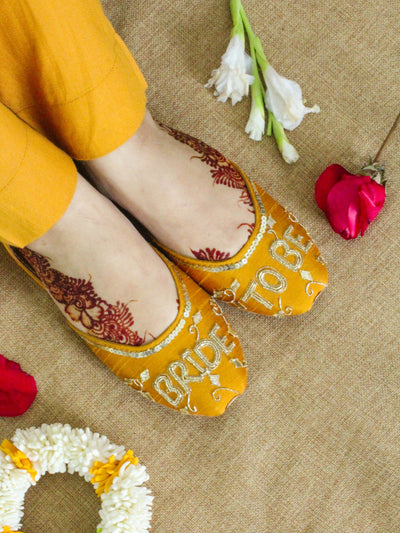 Presenting BRIDE TO BE Khussa for all our Beautiful Brides with shiny traditional Gota work on bright orange and mustard base to complete your Bridal attire.
