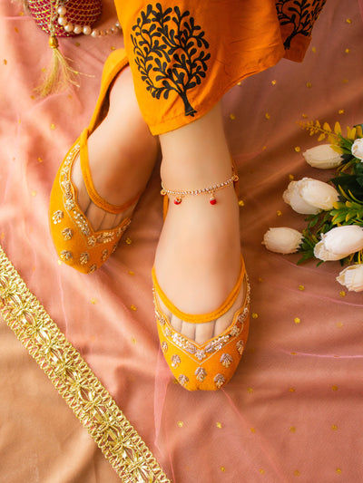 A beautiful Mustard Velvet serves as a canvas for this exquisite scallops design. These tilla, naqshi, zardozi, moti, sitara & chain details with a sheer scallop detailing. This jutti is a fit for all. It can be styled any pastel or jewel tone outfit alike.
